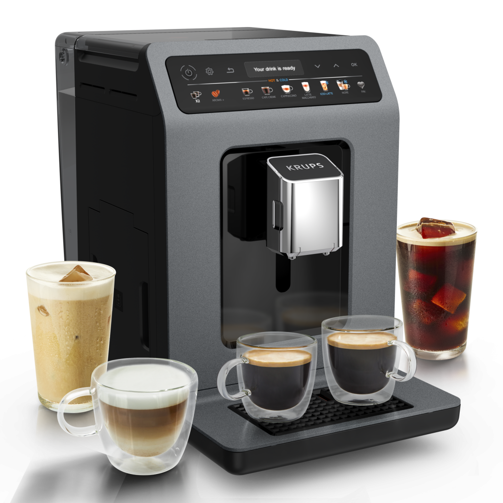 KRUPS Evidence Hot & Cold vam prinaša vrhunsko doživetje kave doma s 18 toplimi in hladnimi recepti, ki ponujajo neskončno raznolikost. Ta avtomatski espresso aparat pripravlja popoln espresso, kapučino ali hladne napitke, kot sta ledeni latte in ledena kava, z dotikom gumba – z edinstveno večstopenjsko Cold Brew aromo tehnologijo, ki zagotavlja polno ekstrakcijo okusa ter intuitiven vmesnik za vse vaše najljubše napitke, pripravljene do popolnosti, dan za dnem.
