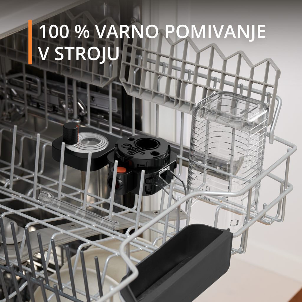 Poleg samodejnega splakovanja so vsi deli posode za mleko razstavljivi in pralni v pomivalnem stroju, kar zagotavlja enostavno čiščenje in popolno higieno.