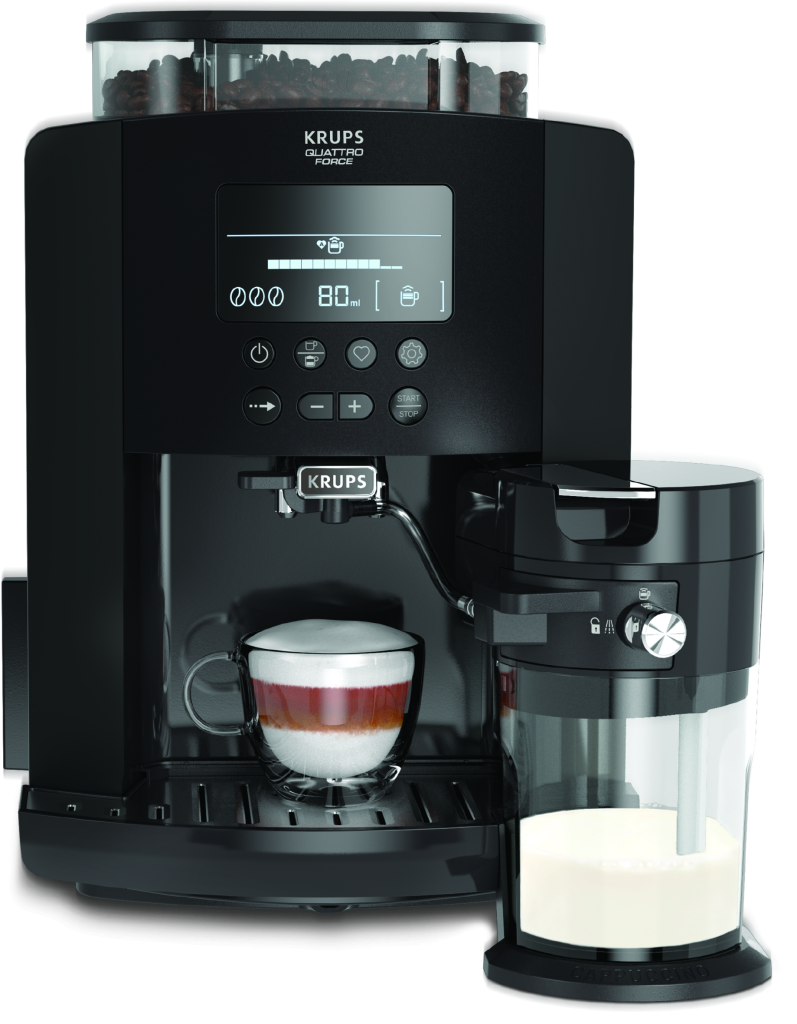 Z aparatom KUPS Arabica Latte za avtomatsko pripravo espressa na najlažji način poskusite izvrsten napitek, ki vam zagotavlja popolno aromo v vašem domu. Zahvaljujoč uporabniškim nastavitvam in zelo velikemu LCD zaslonu, ki nudi enkratno izkušnjo pri pripravi napitka, aparat zagotavlja izdelavo izrednega espressa in cappuccina z enostavnim prtiskom na tipko. Tri nastavitve za pripravo mleka vam omogočajo, da pripravite vaš kremast napitek po vaši želji ,pameten način pa vam omogoča hrambo štirih prilagojenih receptur. Enostvano čiščenje je zagotovljeno zaradi snemljivega rezervoarja za vodo in snemljive posode za mleko, ki je sestavljena iz treh komponent. Sistem KRUPS Quattro Force proizvaja izjemen okus kave, zahvaljujoč posebej oblikovani tehnologiji za optimalno mletje, popoln potisk, pripravo in avtomatsko čiščenje.